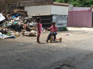 Un bambino che si muove su un triciclo, in una strada sgangherata, piena di rifiuti, e ha bisogno di stima e incoraggiamento.